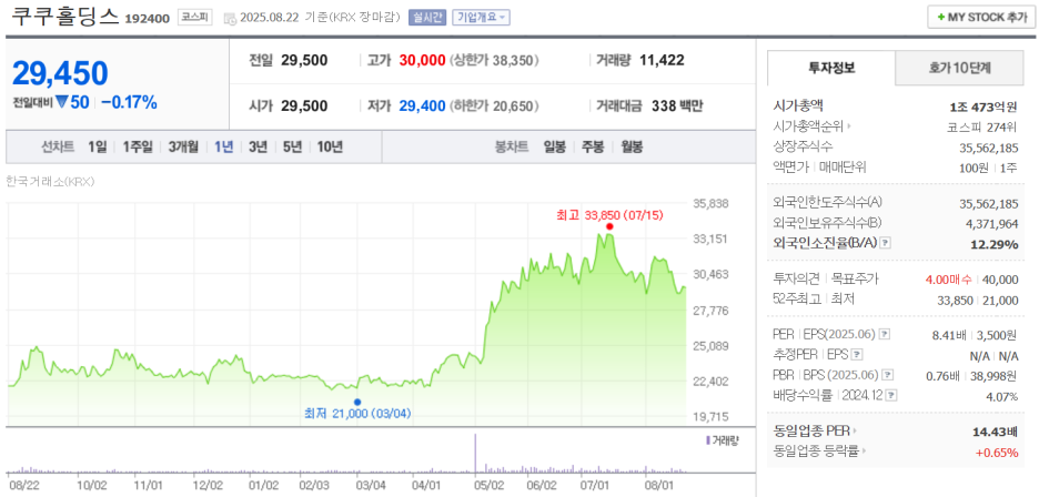 쿠쿠홀딩스 주가는 29,450원으로 마감했습니다. 1년간 최저가는 21,000원(3월 4일), 최고가는 33,850원(7월 15일)으로, 연초 이후 꾸준한 상승세를 보이다 최근 조정을 받고 있습니다.