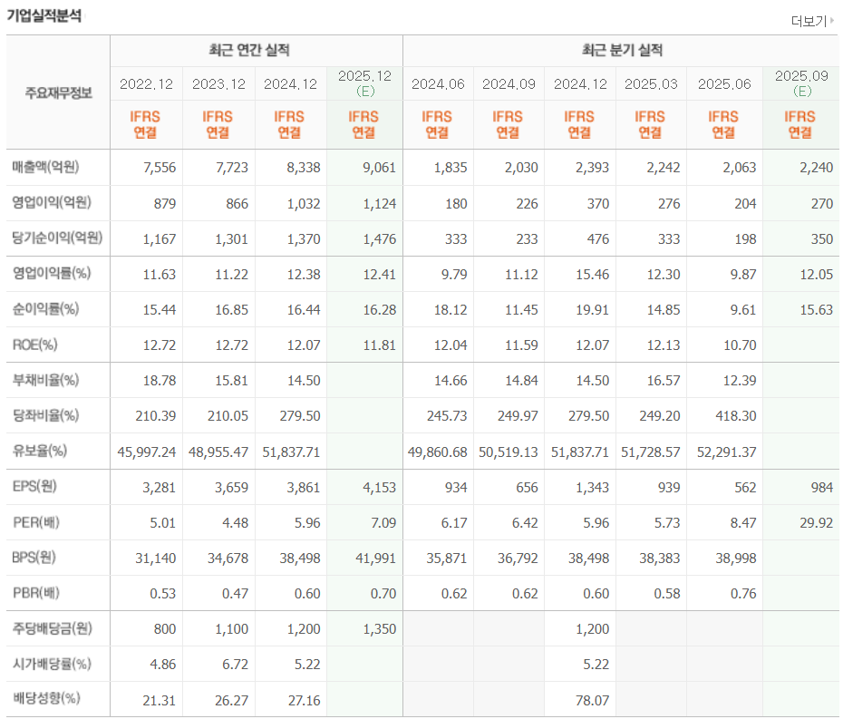 2024년 매출은 8,338억 원, 영업이익 1,032억 원, 순이익 1,370억 원을 기록했습니다. 2025년 예상 매출은 9,061억 원, 순이익 1,476억 원으로 안정적인 성장세가 전망됩니다.